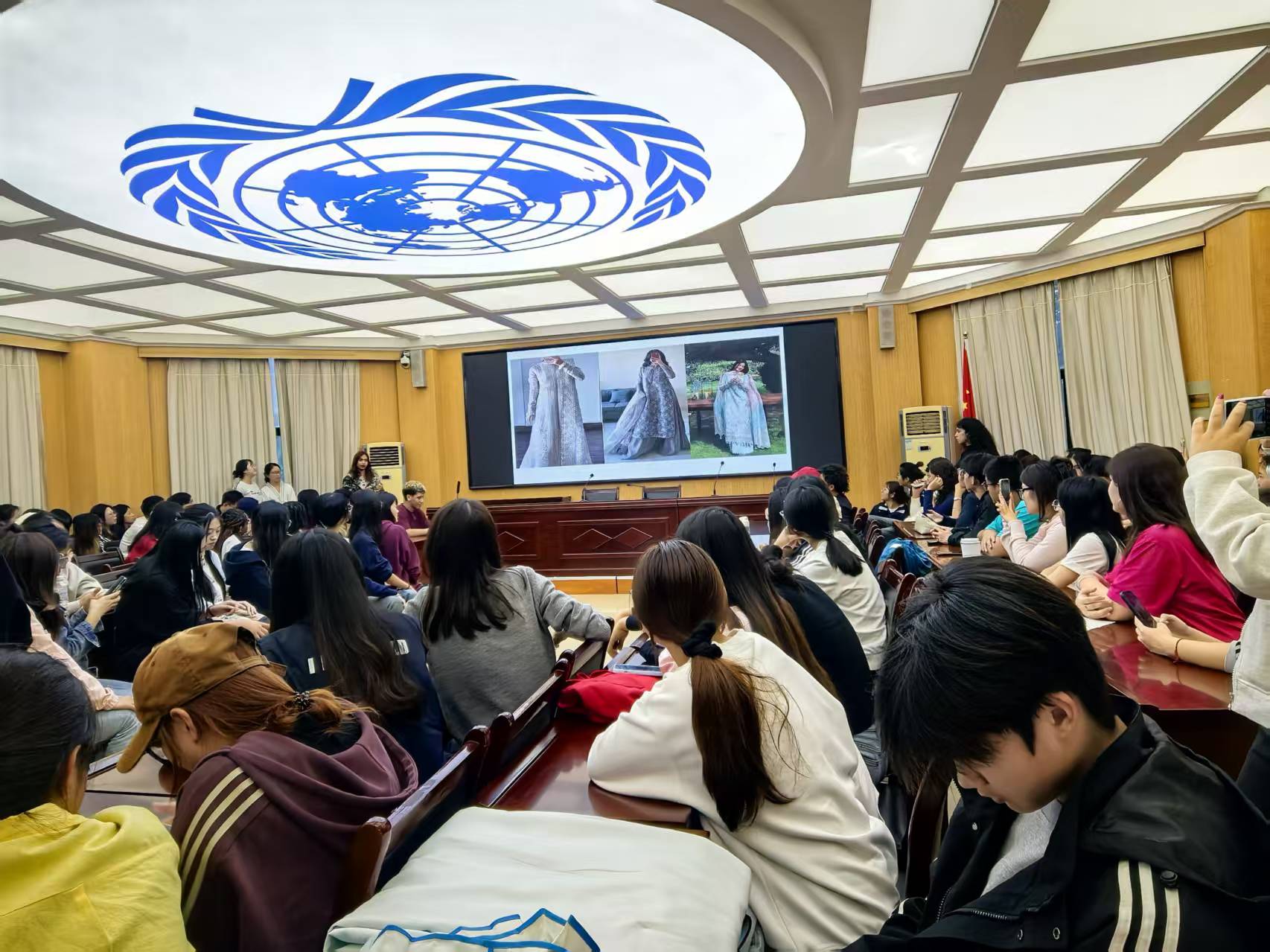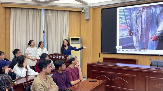 本次活动以服饰文化为主题。在近两小时的活动中,会议室始终热度不减——参与者或围绕某件服饰展开讨论,或互相拍照记录特色服饰,甚至有中外学生现场尝试搭配对方民族服饰元素,在欢声笑语中打破文化隔阂。国际化氛围也渗透在每一个交流细节里:现场摆放的多语种文化手册,为不同母语的参与者提供信息支持;交流环节设置“双语翻译志愿者”,帮助语言表达存在障碍的师生顺畅沟通;互动区展示的中外传统服饰,让跨文化交流在实物传递中落地生根。这些精心设计的环节,不仅让国际化从“概念”变为“可感可触的体验”,更让中外师生在轻松愉悦的氛围中打破文化隔阂,增进彼此理解。